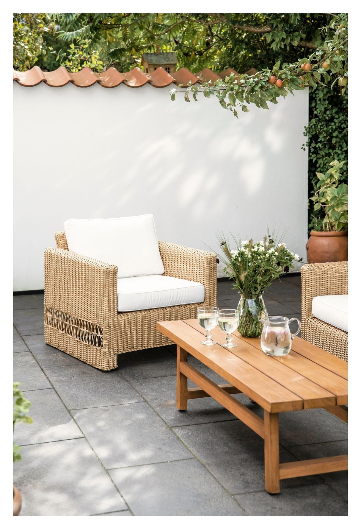 Carrie Exterior Loungestol, Natur er en smuk og stilfuld loungestol fra Sika-Designs Carrie-serie. Den er håndlavet i vejrbestandigt og vedligeholdelsesfrit ArtFibre materiale, som er lavet af polyethylen. Stolen har et stærkt håndbøjet aluminiumsstel og kan bruges både indendørs og udendørs. Hynde medfølger ikke. Med sin naturlige farve og komfortable sædehøjde på 44 cm er denne loungestol perfekt til afslapning i haven eller på terrassen.