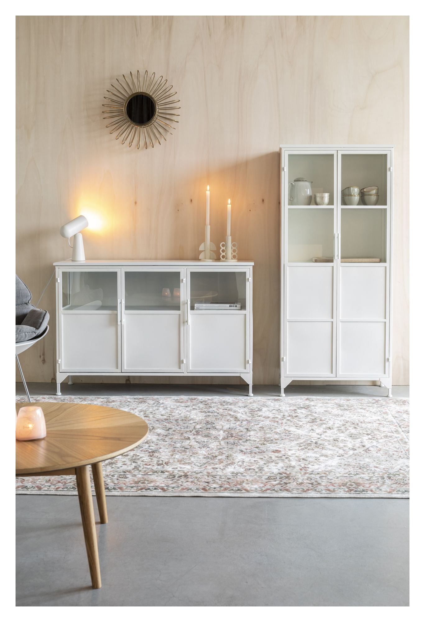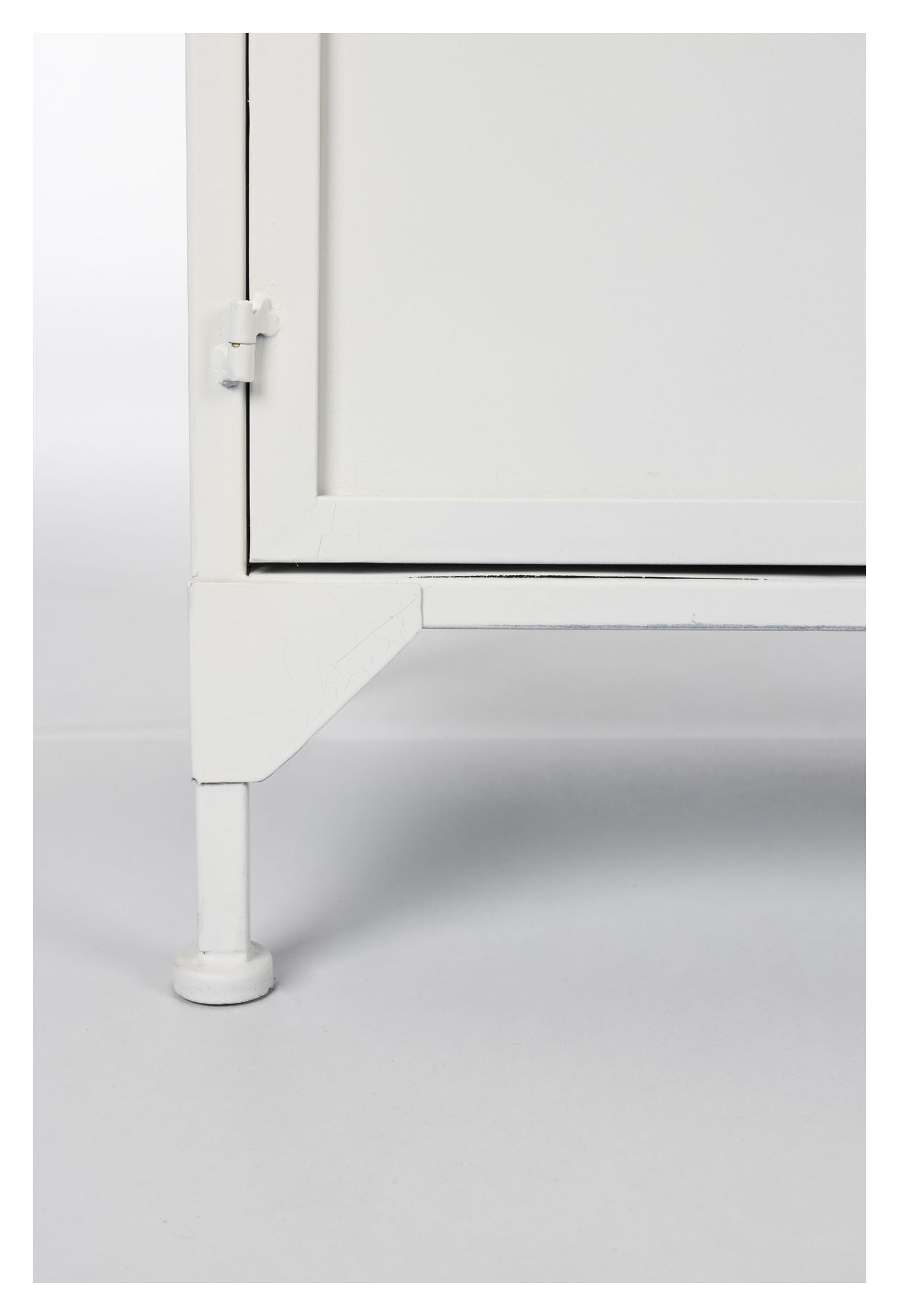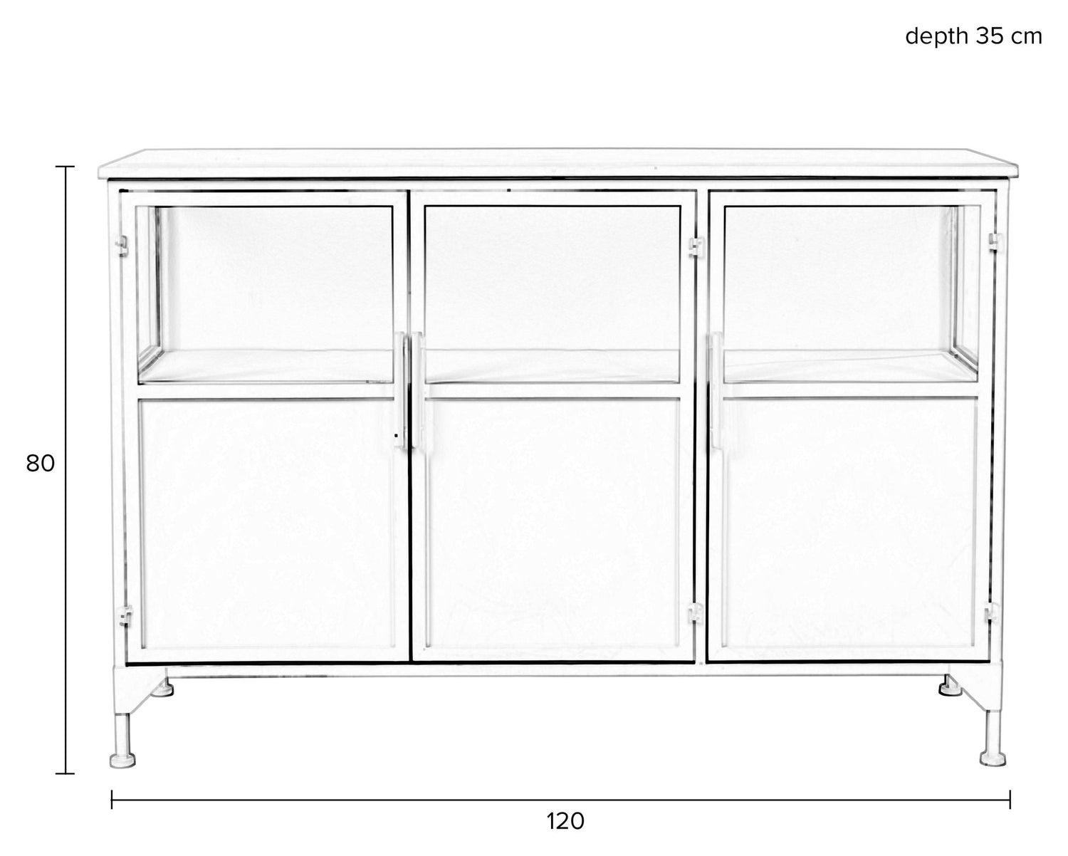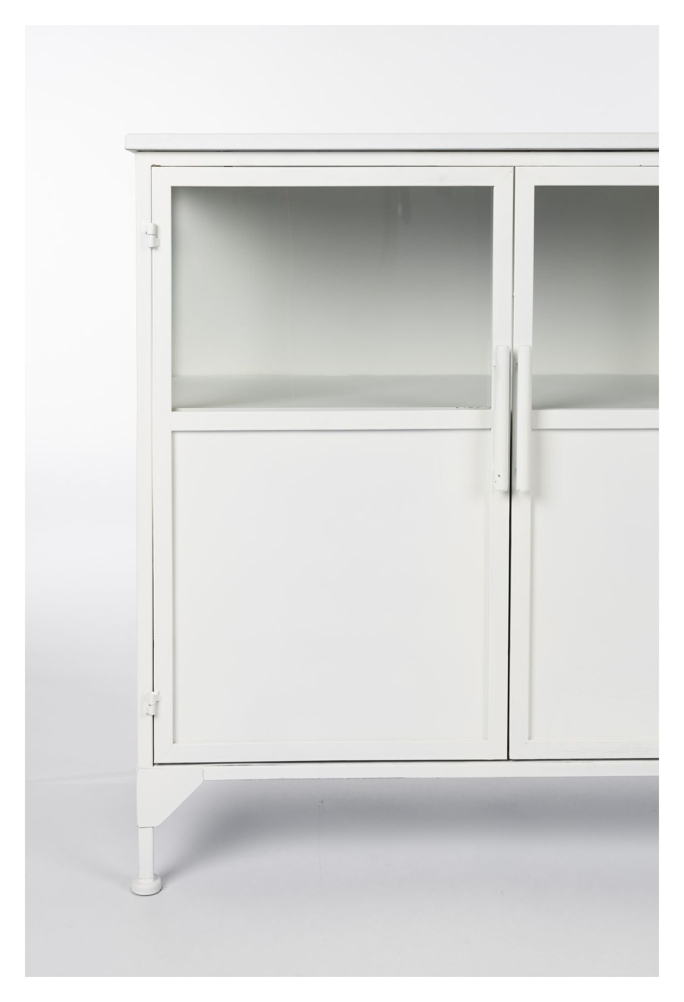- Materiale: Jern (White powder coated iron cabinet with clear tempered glass windows.)