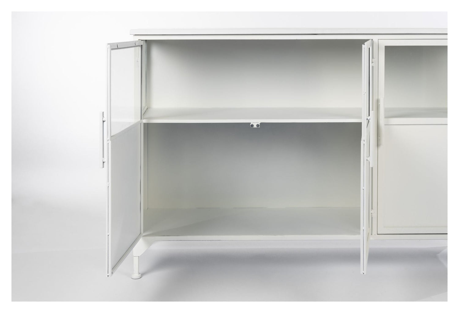 Den homii Miya Skænk, B120, Hvid er en stilfuld og moderne skænk lavet af pulverlakeret jern. Med hvide låger og hærdet glasvinduer tilføjer den et elegant touch til ethvert rum. Denne skænk er perfekt til opbevaring af dine ejendele og vil være et smukt og funktionelt tilføjelse til dit hjem.