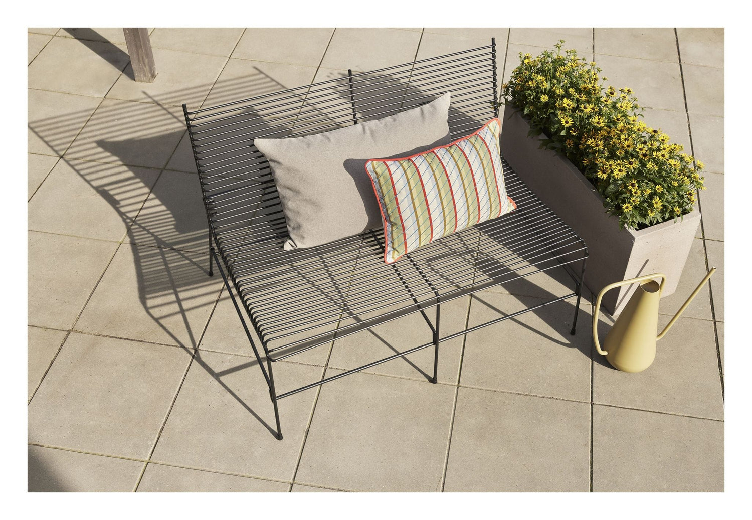 "Få en smuk og funktionel siddeplads til din have med denne sorte String Havebænk. Den vil tilføje et strejf af elegance og komfort til dit udendørsområde."
