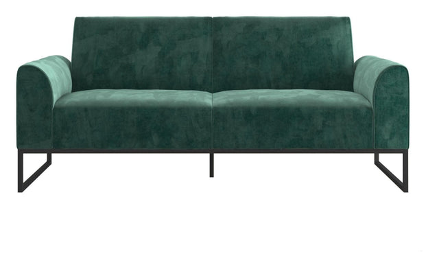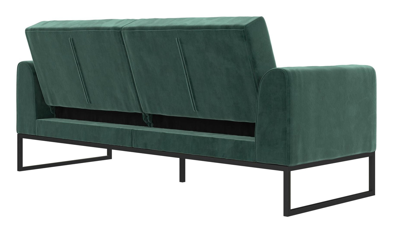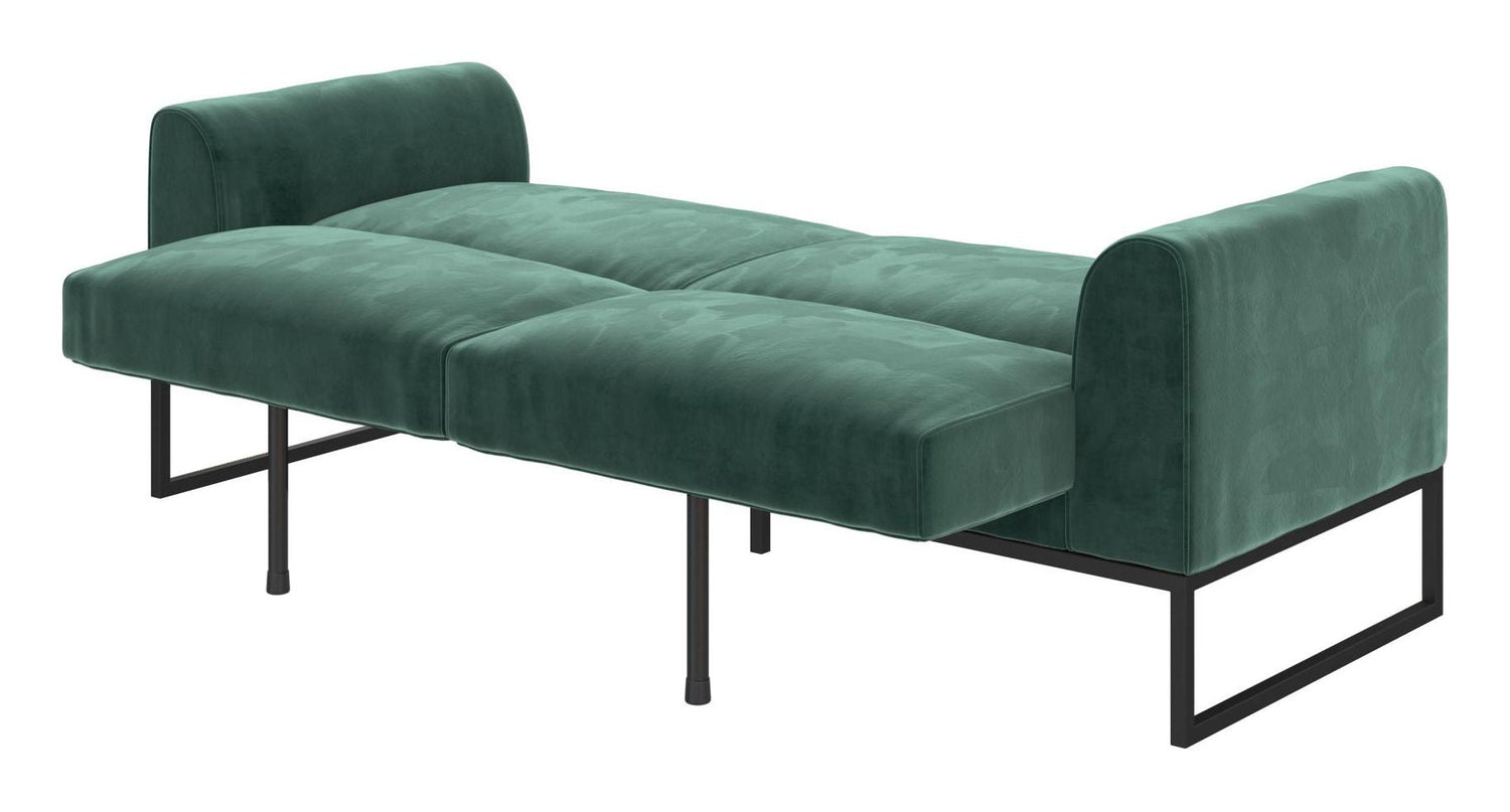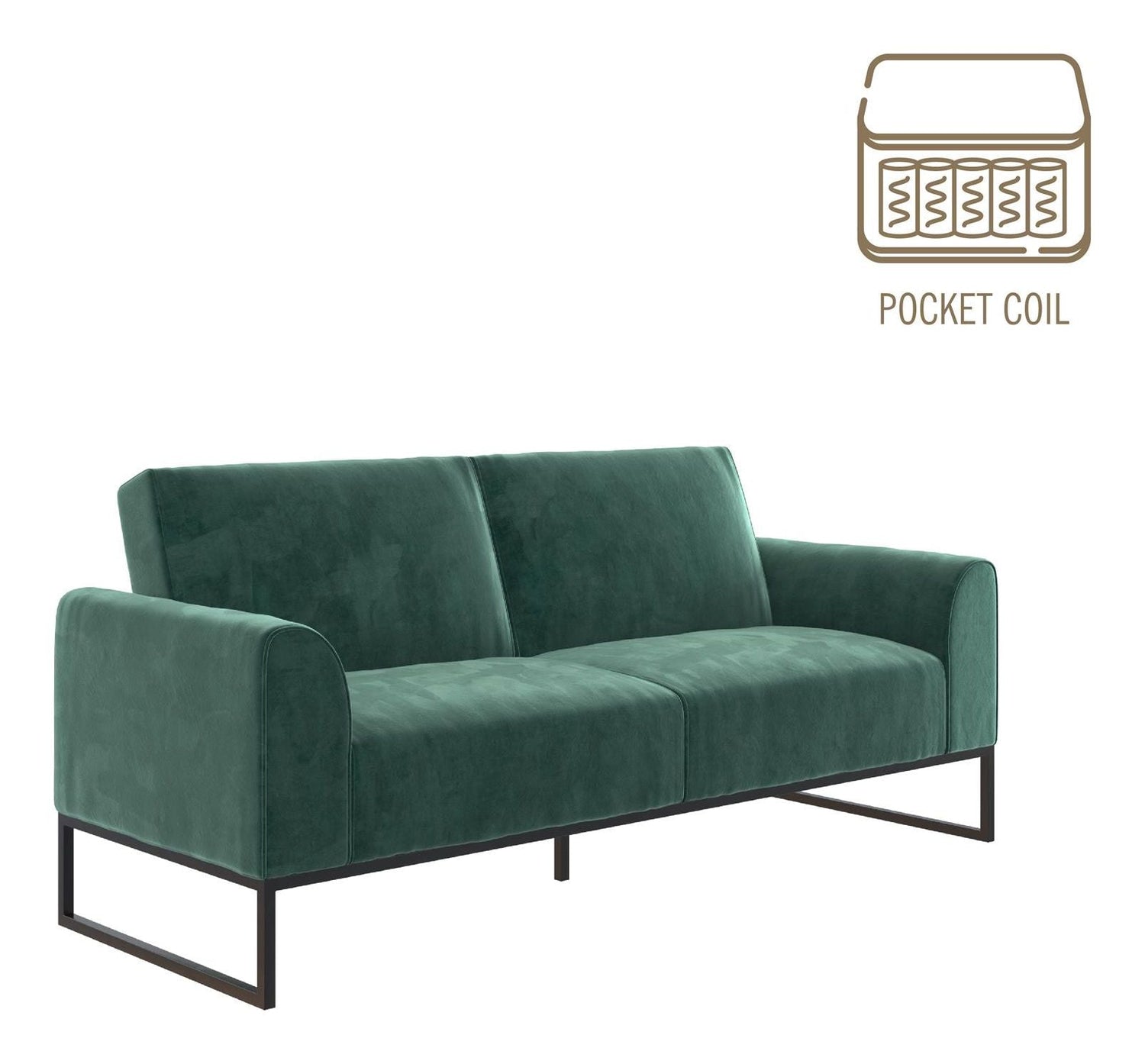 Adley Coil Sovesofa - Grøn fløjl er det perfekte møbel til at glamorisere dit hjem. Denne moderne sovesofa er et blikfang med sit fløjlsmateriale, afrundede armlæn og sorte metalben. Med sin split-back design kan du nemt justere ryglænet i tre positioner: sidde, hvile og sove. Takket være fjedrene er eftermiddagslur nu endnu mere behagelige. Giv dit hjem et løft med CosmoLiving Adley Coil Sovesofa og lad dine gæster føle sig helt specielle!