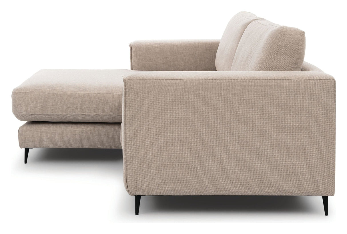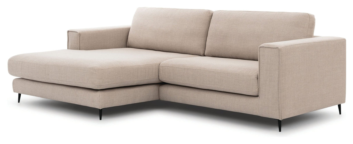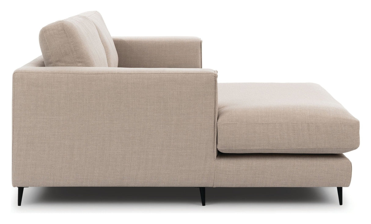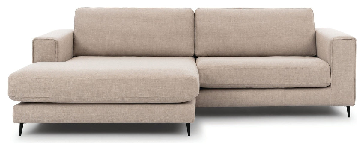 PALMA Sofa m. bred chaiselong XL venstre, Beige er det perfekte valg til dit hjem. Med sin rummelige chaiselong og behagelige sædepude af 35 KG koldskum kan du slappe af i stil. Sofaen har en solid træramme og sort metalben, der giver stabilitet og elegance. Det vendbare rygpude i siliconefibre tilføjer ekstra komfort. Denne sofa er lavet af 100% polyester i en smuk beige farve, der passer til enhver indretning. Med en Martindale-værdi på 50000 er stoffet slidstærkt og holdbart. Med PALMA Sofa m. bred chaiselong XL venstre, Beige får du ikke kun et smukt møbel, men også en komfortabel og holdbar løsning til dit hjem.