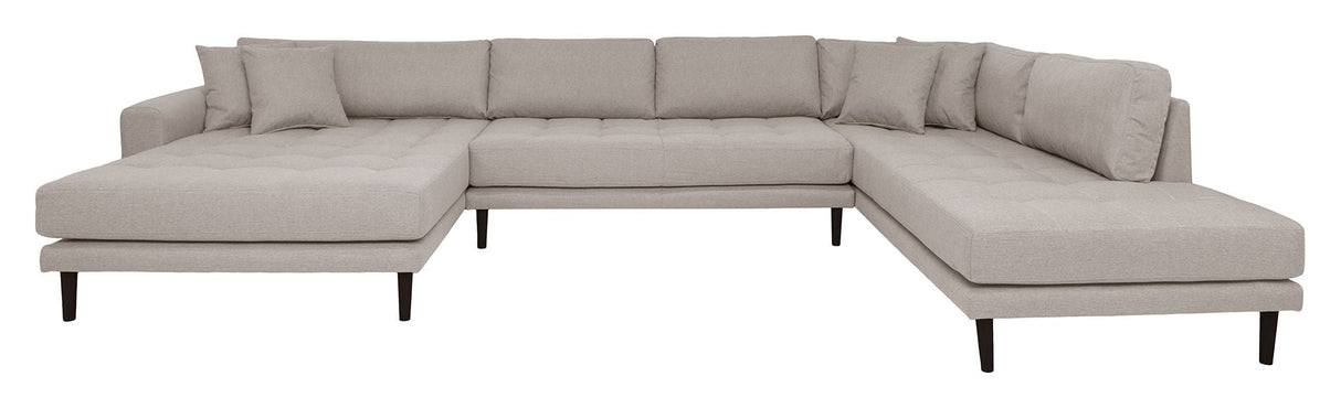 U-sofaen Lido er perfekt til at skabe en hyggelig og stilfuld atmosfære i dit hjem. Den venstre vendte åbne ende giver fleksibilitet i indretningen, og den grå stenfarve tilføjer et moderne touch. Med en sædedybde på 210/163/84 cm og fire puder er komforten i top. Fremstillet af 100% polyester og eg, er denne sofa både holdbar og elegant. Forkæl dig selv med denne luksuriøse sofa, der vil tilføje stil og komfort til dit hjem.
