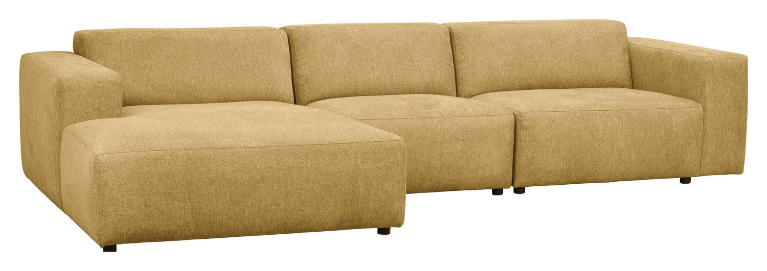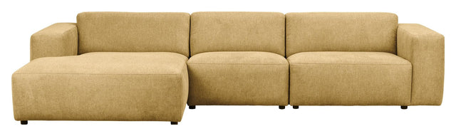 Willard, 4-pers. chaiselong venstre - gul er en minimalistisk og moderne loungesofa med plads til mange. Den er klædt i det tidløse kvalitetstof Brenda gul (#68), som giver en varm og indbydende følelse. Den generøse chaiselong giver ekstra siddepladser, perfekt til at samle familie og venner i stuen. Sofaen er bygget som en modulsofa, så du kan tilpasse den efter dine ønsker. Den fås i forskellige farver og materialer, og er FSC-certificeret, hvilket betyder at træet kommer fra bæredygtig skovdrift.
