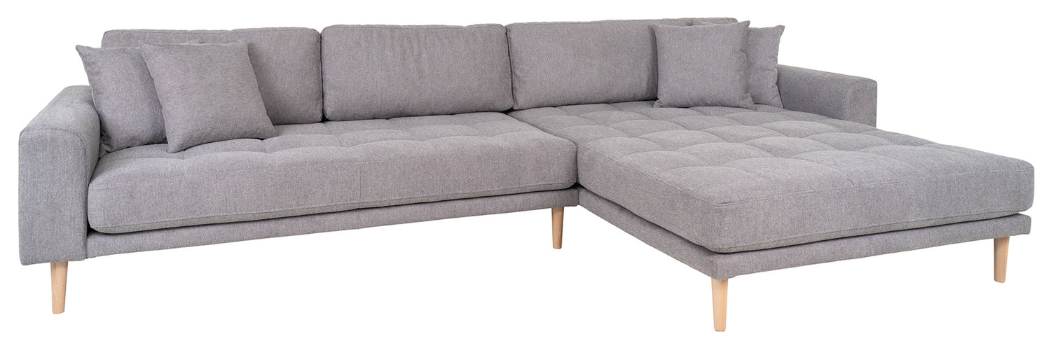 Lounge sofa m. Højrevendt chaiselong, Lysegrå m. puder og natur træben