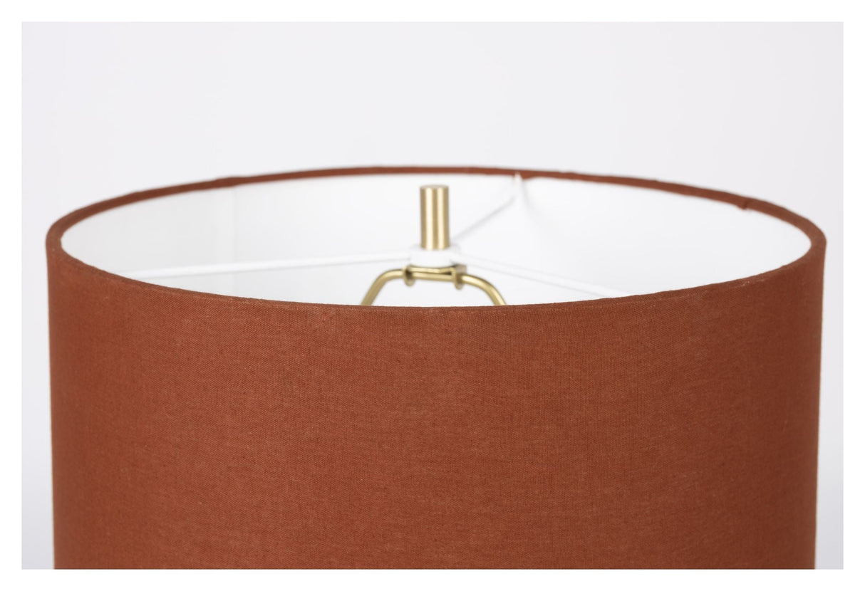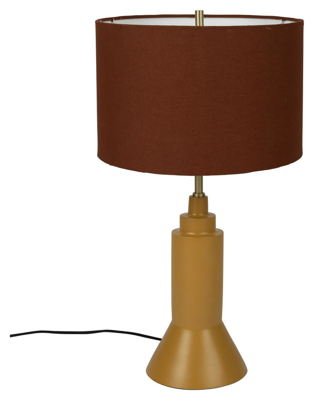 • Materiale: Bomuld (Cotton textile shade with white painted iron frame. Matt brass polished body on amber gold powder coated iron base. Black cotton fabric cable with inline on/off switch.)