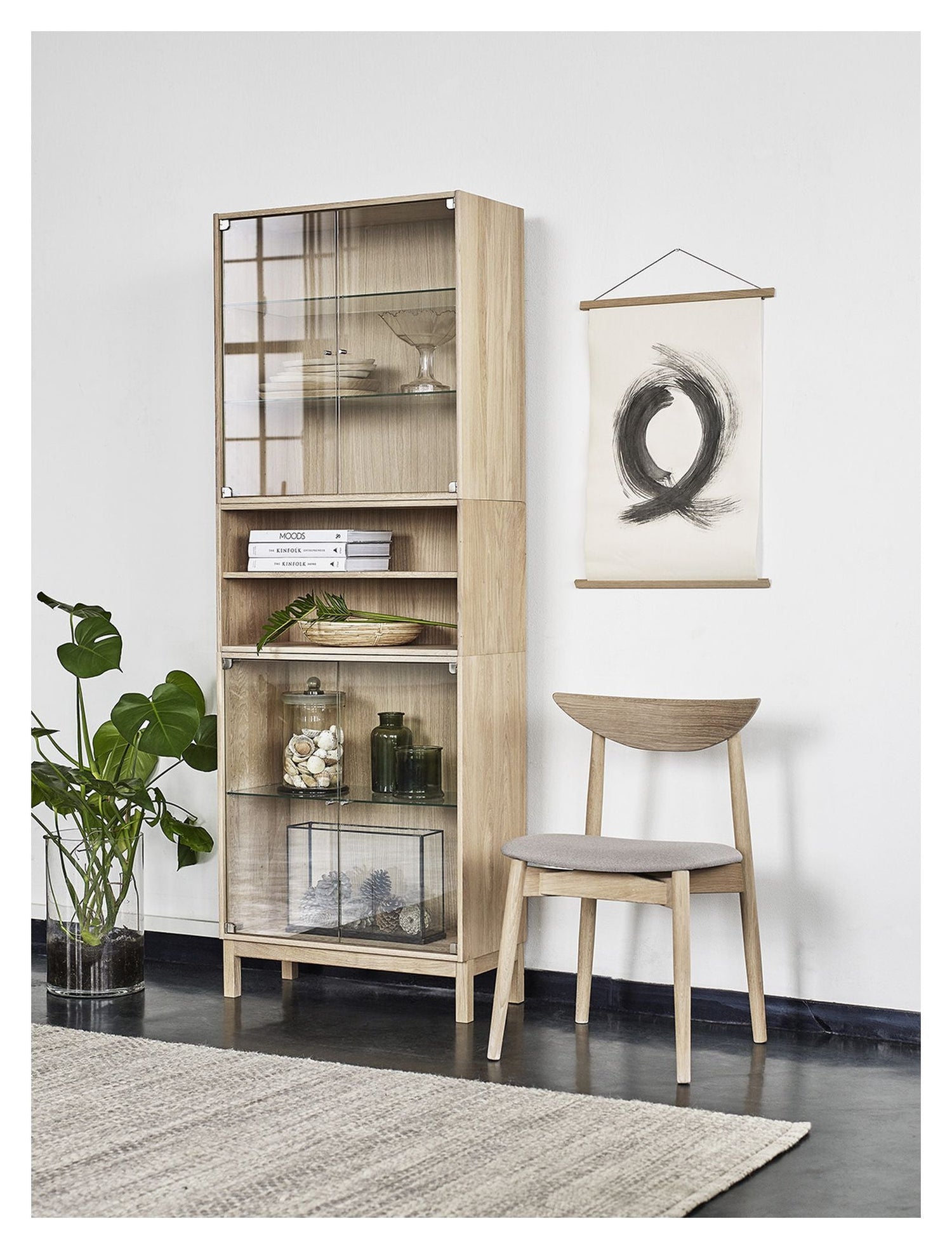 "Få et smukt og stilfuldt vitrineskab til at vise dine yndlingsgenstande frem. Den hvidolierede eg og de elegante glaslåger skaber en luksuriøs og moderne atmosfære i dit hjem."