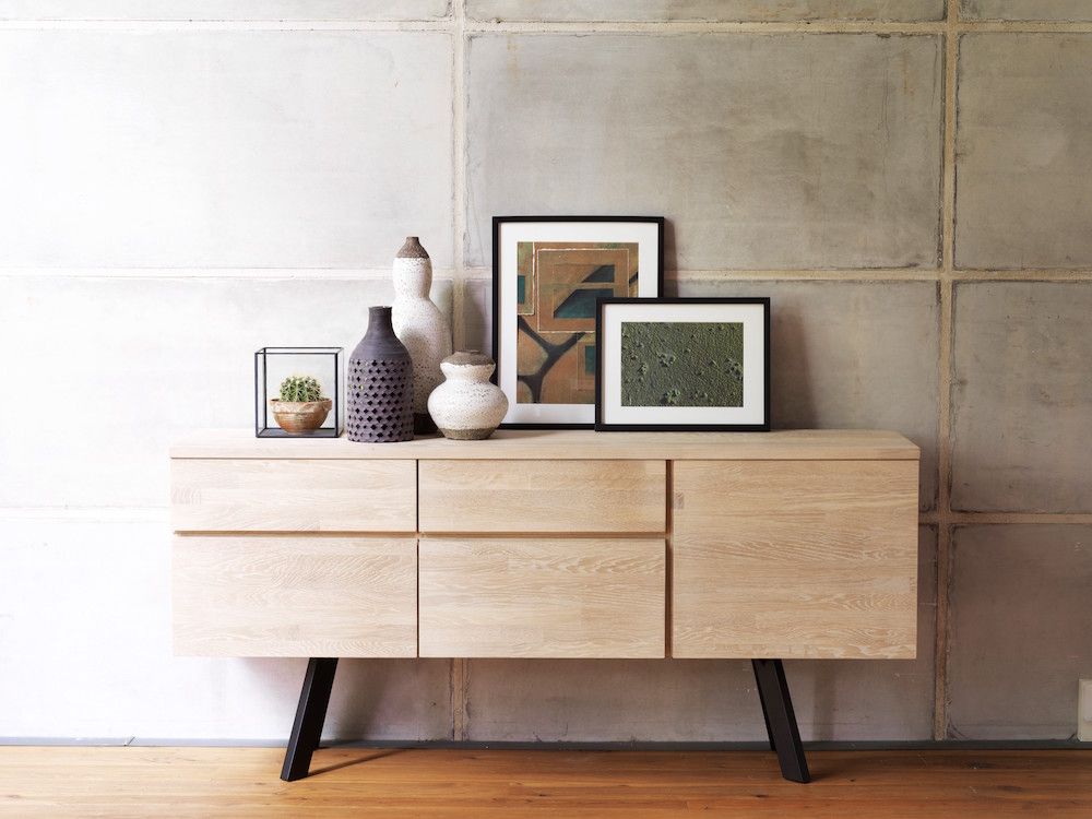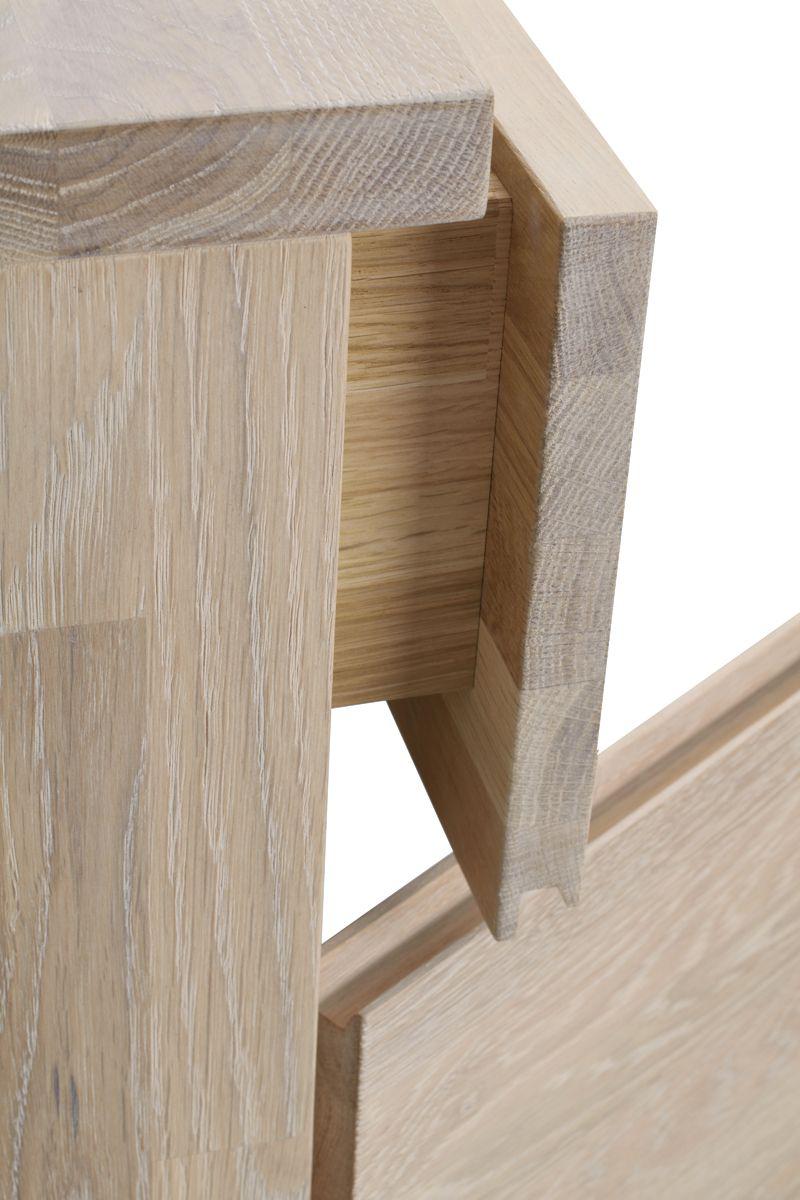 - Materiale: Eg (Solid finger jointed oak in white wash lacquer. Steel brushed surface on top. Legs in black powder coated metal.)