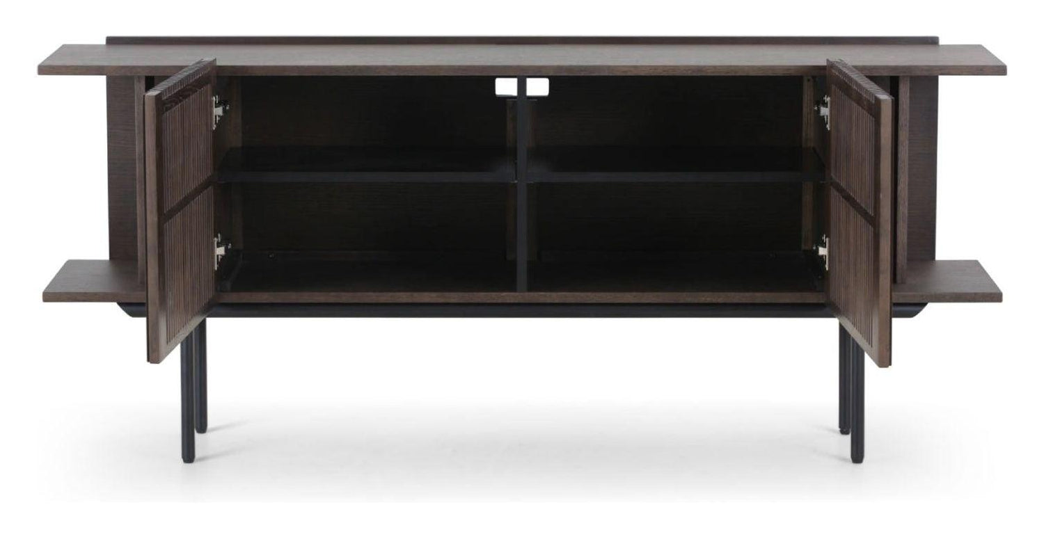 Louvre XL Skænk, Røget Eg er en stilfuld og funktionel opbevaringsløsning til dit hjem. Den er lavet af massiv eg og eg finer, hvilket giver den en holdbar og elegant finish. Skænken har selvlukkende "soft close" hængsler, der sikrer en blid og lydløs lukning. De smarte uskæringer gør det nemt at føre kabler til dine elektroniske enheder, mens de højdejusterbare fødder giver dig mulighed for at tilpasse skænken til din ønskede højde. Med sin brune farve passer Louvre XL Skænk perfekt ind i enhver indretning.