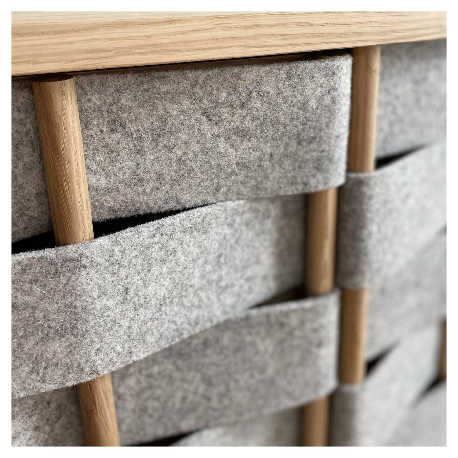 Denne Njordec Felt Højskænk i lys eg er et fantastisk møbel, der kombinerer solidt egetræ, egetræsfiner og italiensk uldfilt i en luksuriøs vævet serie. Det unikke 360 graders vævning gør dette møbel forbløffende fra enhver vinkel. Med usynlig skinne til skydedør og fremstillet i EU er denne højskænk både stilfuld og funktionel.