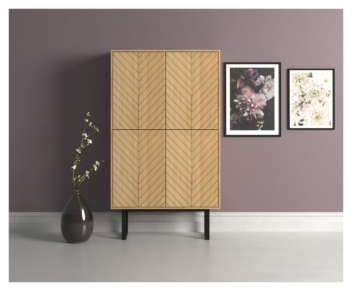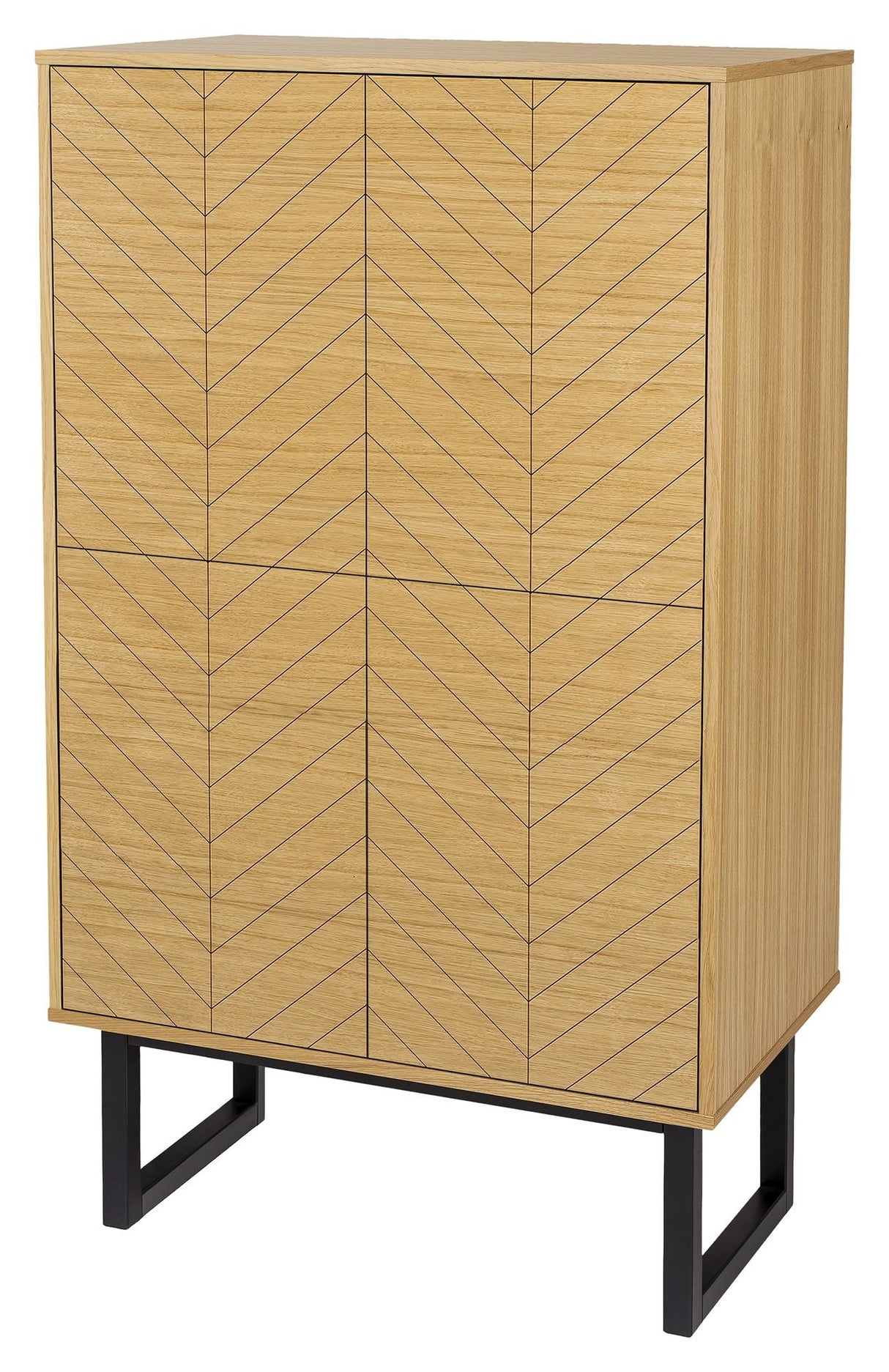 "Få styr på dine ting med stil! Denne Woodman Camden Højskænk Herringbone er ikke kun praktisk, men også utrolig smuk. Det elegante herringbone mønsterprint og de sorte ben giver et moderne og sofistikeret udseende. Skab et organiseret og stilfuldt hjem med denne højskænk."