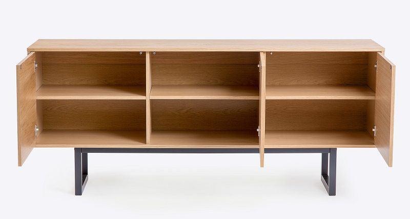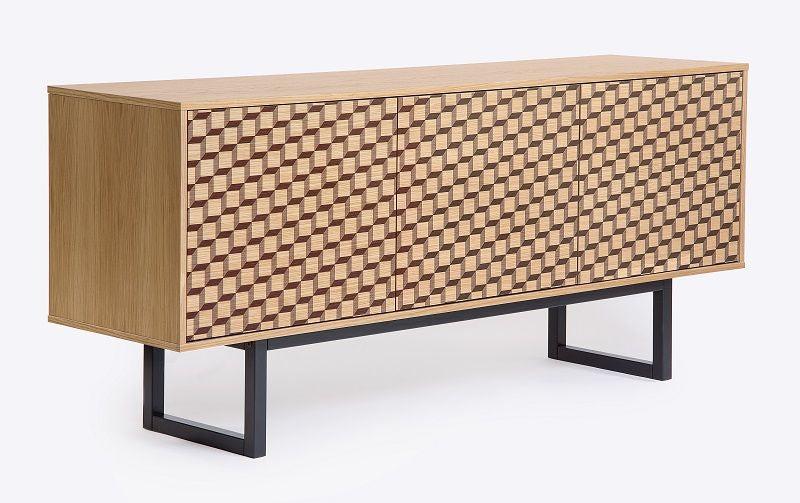 - Materiale: Finer (Product made of oak veneered particleboard. Oak veneerd details are painted with matt clear lack, gloss 10%. Legs frame made of solid birch which is stained with black stains and paited with clear matt lack. Doors are printed with three different designs.)