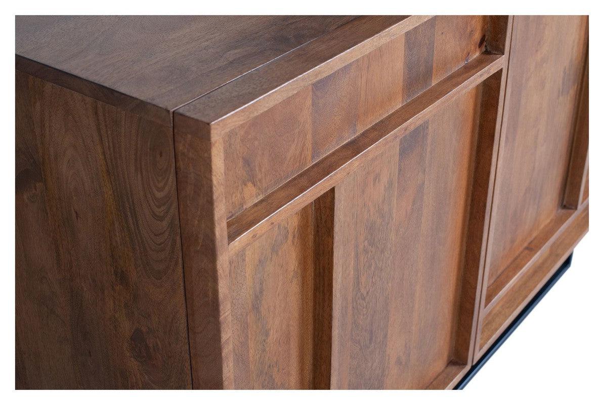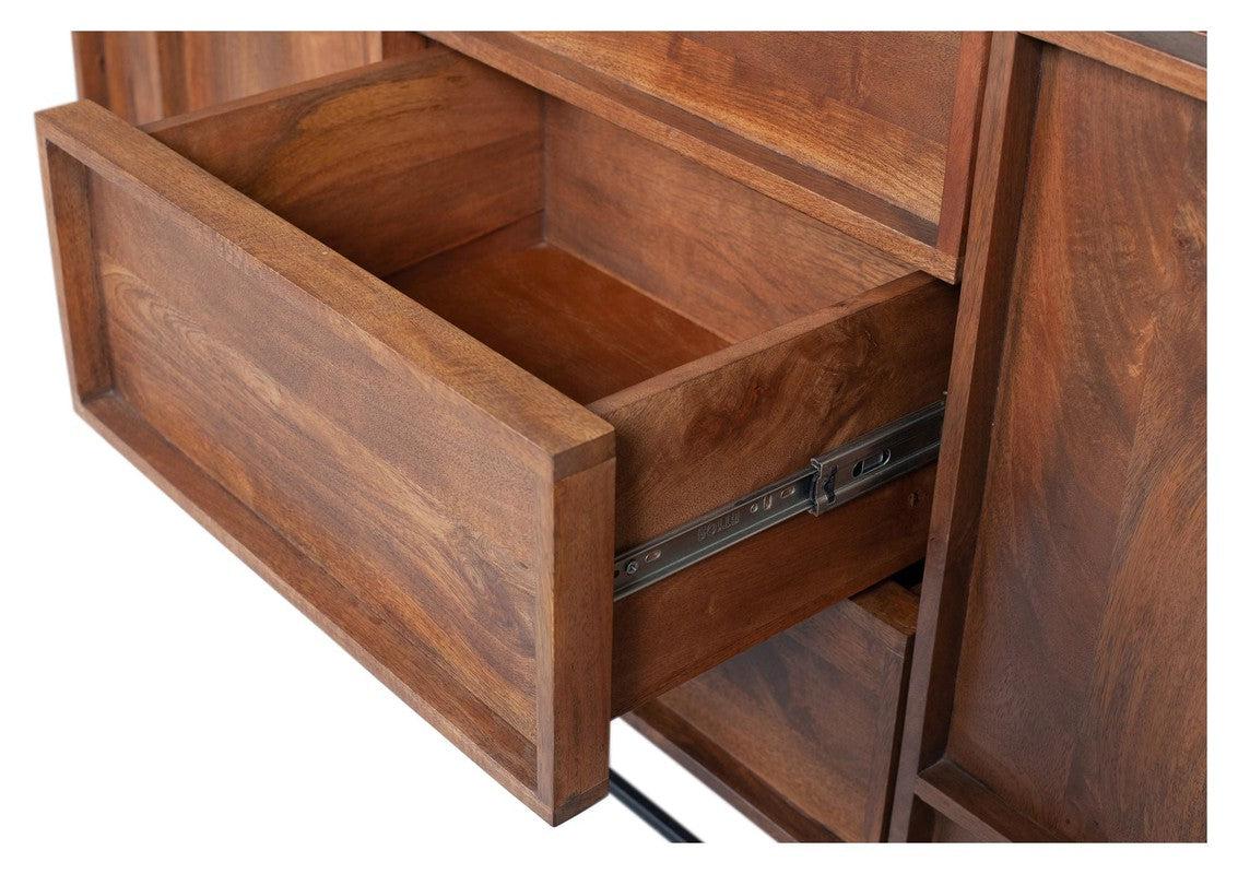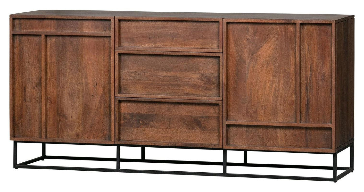 Denne Woood Forrest Skænk er lavet af naturligt mango træ og har et smukt mørkt træfarve. Den har to døre med håndtag i den øverste kant af rammen og tre skuffer i to forskellige størrelser. Bag lågerne finder du en hylde, og skænken er monteret på sorte metalben. Perfekt til opbevaring og tilføjelse af et naturligt touch til dit hjem.