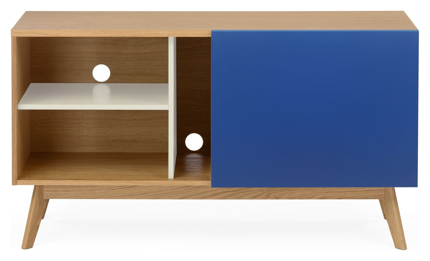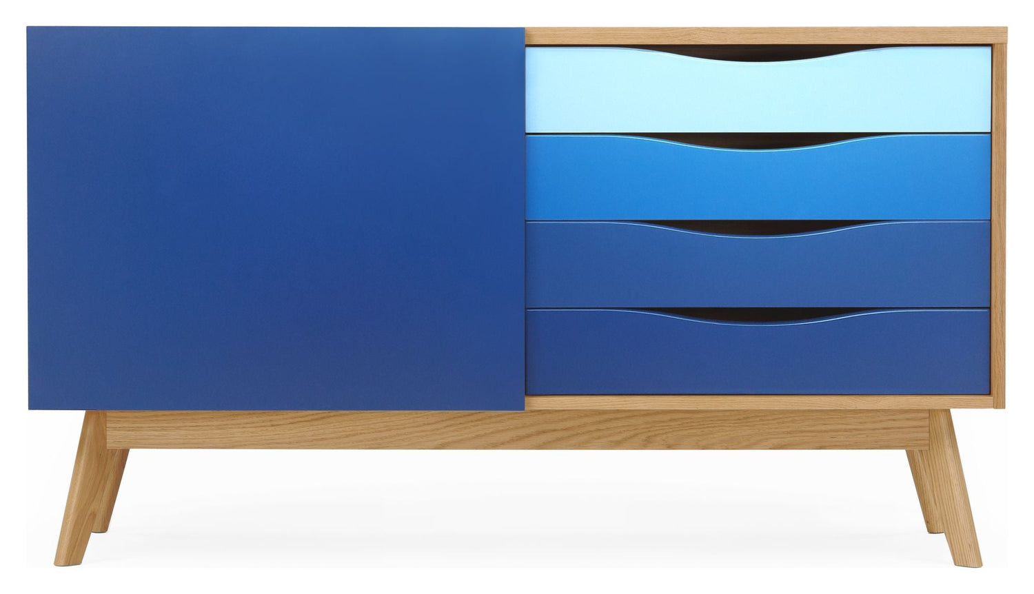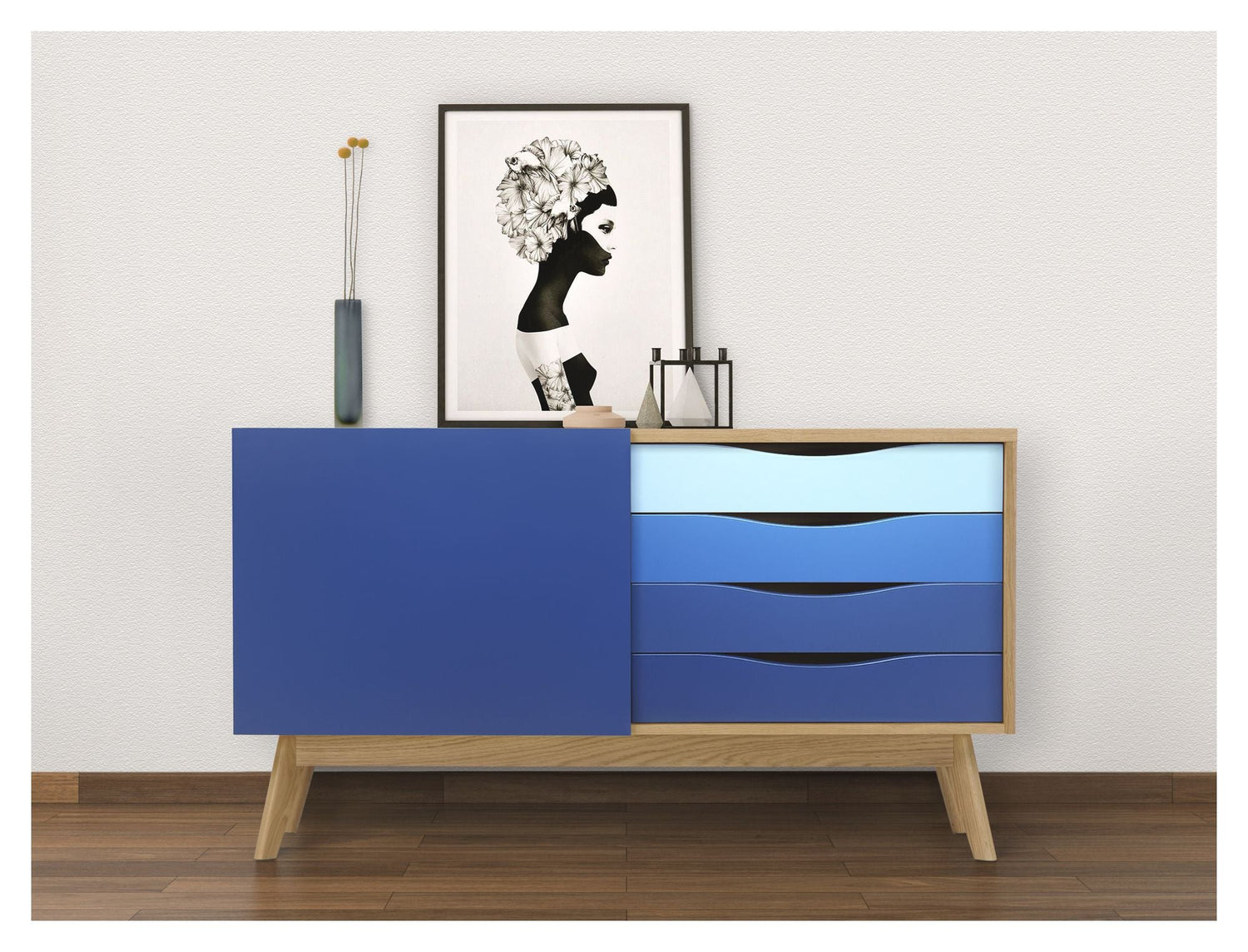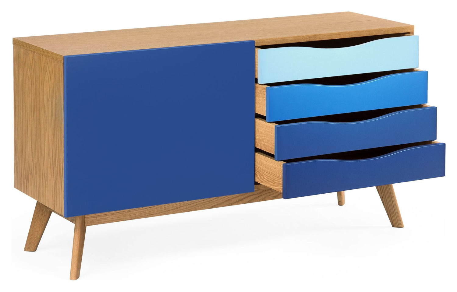"Få en elegant og moderne opbevaringsløsning med Avon Skænk, Blå nuancer/Eg. Den blå farve tilføjer et friskt og unikt touch til dit hjem, samtidig med at den giver masser af plads til at gemme dine ejendele væk. Skab et stilfuldt og organiseret rum med denne skænk."