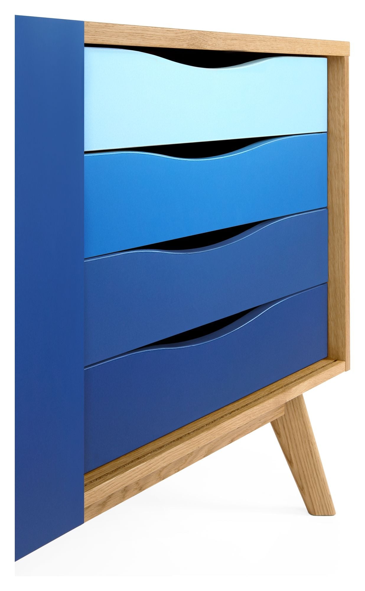Avon Skænk, Blå nuancer/Eg er en stilfuld og funktionel skænk fra Woodman's Avon-serie. Den er lavet af solid eg og har et smukt blåt farvetema. Skænken har masser af opbevaringsplads og er perfekt til at organisere dine ting.